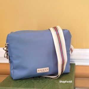 This Gucci toiletry bag features a sophisticated Green color and a structured rectangular shape, making it both stylish and functional. Crafted from smooth polyster material, it is adorned with gold-toned hardware that adds a touch of luxury to its design.