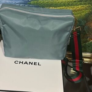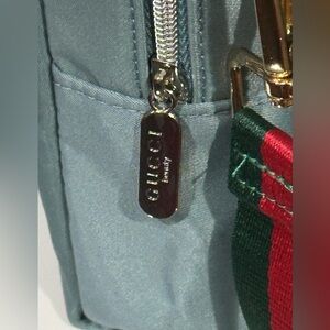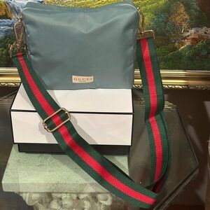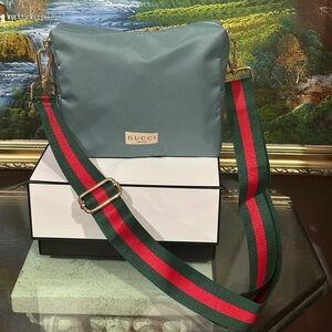 This Gucci toiletry bag features a sophisticated Green color and a structured rectangular shape, making it both stylish and functional. Crafted from smooth polyster material, it is adorned with gold-toned hardware that adds a touch of luxury to its design.