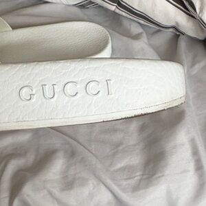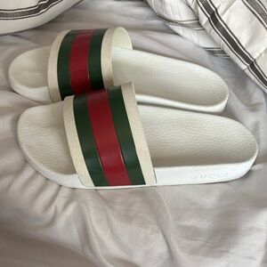 Chic Gucci slides featuring bold red and green stripes. Perfect for casual wear. Size 8