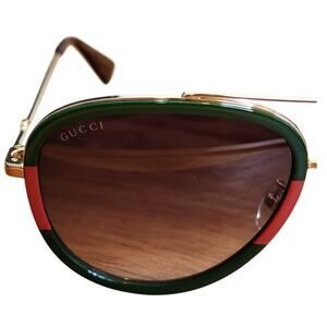 Stylish Gucci sunglasses with green and red accents. Gold frame adds elegance. Perfect for any occasion.