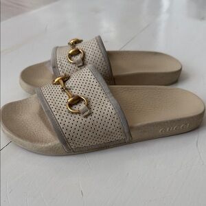 Comfort and style come together with these slide sandals from Gucci. The grey slides are crafted from suede and feature an open toe silhouette. They flaunt the signature Horsebit detail in gold-tone on the vamps.