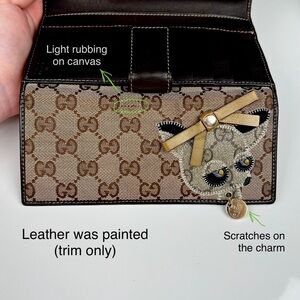 Excellent pre loved condition! There is light rubbing on the canvas and scratches on the charm. Leather edge trim and leather flap was painted due to wear, interior is untouched.