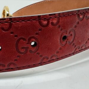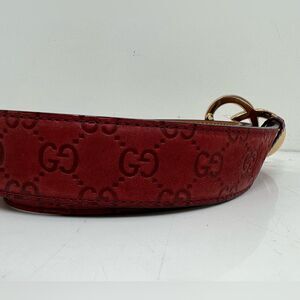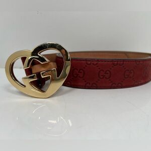 Gucci Guccisima Red Interlocking G Heart Gold Buckle Embossed Leather Belt 34