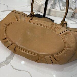 • Material: The bag is made from Guccissima leather, which features the signature GG pattern embossed throughout. The color is a light brown or beige/tan hue.
