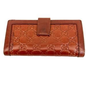 Authentic Gucci Guccissima embossed leather long wallet in rich brown with gold-tone logo plate detail on front. Features multiple card slots, bill compartments, and coin pocket.