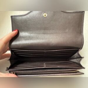 Interior has three long slip pockets, a zip coin compartment and twelve card slots