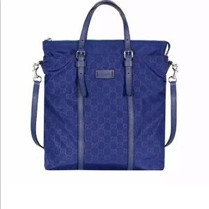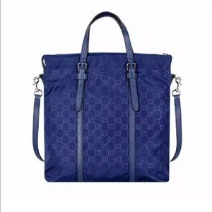 The nylon is navy with GG print and the bag includes two detachable shoulder straps along with an additional crossbody strap.