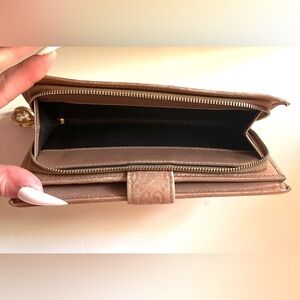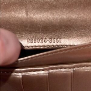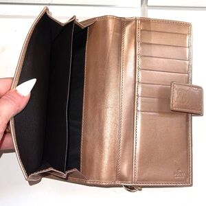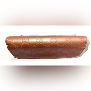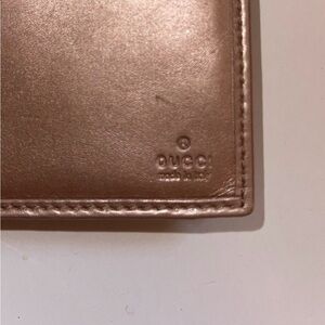 ABSOLUTELY STUNNING METALLIC ROSE GOLD GUCCI WALLET. EMBOSSED GG GUCCISSIMA ALL OVER. GOLD GG ZIPPER PULL CHARM. SNAP CLOSURE BIFOLD. ZIP AROUND COIN COMPARTMENT.