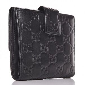 Elevate your accessory collection with this authentic Gucci Guccissima French Flap Wallet in black leather, featuring the iconic GG monogram embossed throughout. The wallet is accented with a gold-tone metal bar engraved with the Gucci logo, adding a touch of elegance to its timeless design.