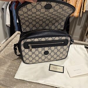 GG Supreme Monogram Textured Dollar Calfskin Web Studded Ophidia Flap Shoulder Bag.