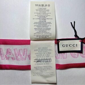 Crafted from soft silk twill, this neck bow is animated by a new interpretation of the classic Hawaiian print, with a lavish scene of palm leaves and vivid anthurium flowers unfolding onto a pink background. The seasonal motto "Hawaiian Gucci Soul" is printed on the reverse.