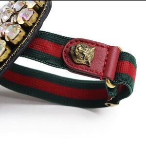Stunning Gucci bracelet featuring a heart design. Adorned with sparkling silver stones and red accents. Perfect for adding elegance to any outfit.