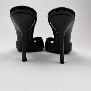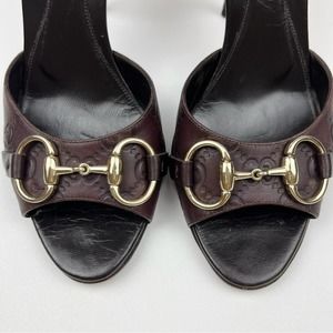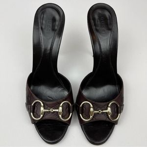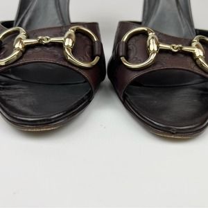 Gucci Hollywood Leather Horsebit Mule open toe Brown GG monogram heels US 8.5