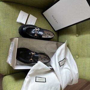 Gucci black horse bit, lug sole loafers in size 38.5. Bee embroidery on back. Worn once. Original box and two dust bags.