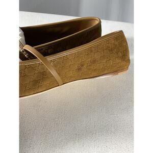 Gucci Horsebit Gg Brown Suede Ballet Flats Size 9 US / EU 39: light gold-toned hardware, leather lining, horsebit, leather bow detail, leather sole, "sacchetto" construction, soft padded insole, leather strap closure with adjustable buckle, flat, measurements: 0.5 inch heel, upper staining and weird staining on soles. Staining or Discoloration - Upper staining and weird staining on soles