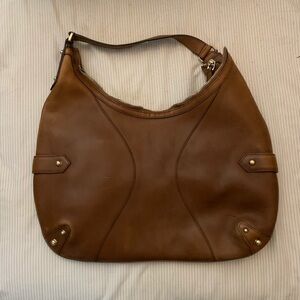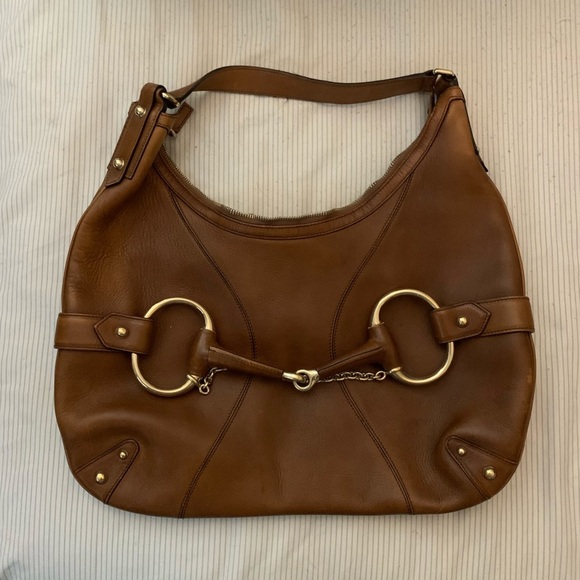 Brown leather hobo bag with gold tone horsebit accent. Top zip closure that opens up to a fabric lined interior that will easily hold all of your essentials. Single handle.
