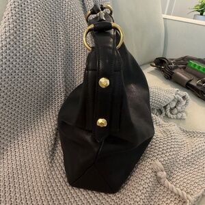 Iconic GUCCI Horsebit Hobo Bag in a yummy black leather with gold hardware. Medium size. 14" wide, 4" deep, 8" high. No signs of scratches or wear. Very good condition. Authentic Gucci purchased at the Gucci Boutique in Costa Mesa, California. Original 4 rivets on the side of purse have been replaced.