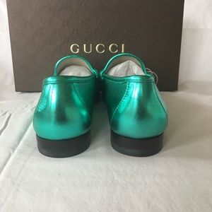 Authentic Gucci, Nappa Green Turquoise Holographic, size EU37.5, New and really beautiful shoes with dust bag and box. The interior dimension in length is 9.75". All Leather.