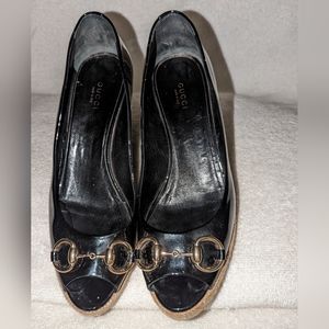 Black patent leather with gold Horsebit on front wedges by Gucci. Made in Italy. Peep toe. Wedges are in good pre-owned condition. Back of the heel on the bottom of the shoe rubber is worn as shown in the picture. Some scratches on one side of shoe. Size is 39 and I am size 9 and they fit but I can't wear heels anymore.