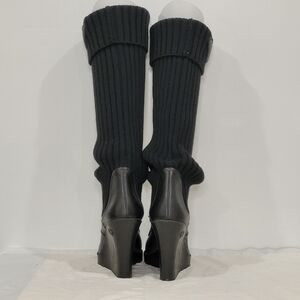 Stylish black ribbed knit wedge boots. Perfect for a chic look.
