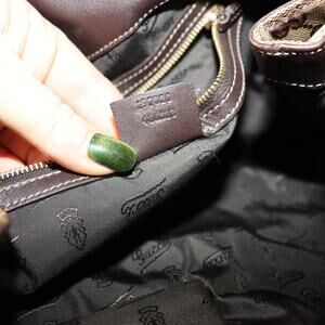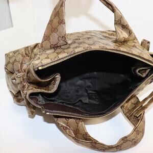 Interior is lined in Gucci-logo fabric with a zip pocket and leather logo tag. Some wear to the coated canvas (see photos), but overall in very nice condition — clean, glossy, and ready for use.