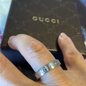 This exquisite Gucci ring features a 18k white gold finish with the iconic GG logo elegantly engraved around the band. Its sleek and classic design makes it a timeless piece, perfect for adding a touch of luxury to any ensemble. Size 5.5, 3.4 grams. No scratches. 💯 % authentic Gucci brand. Comes with box and pouch. Please look at the pictures, video and descriptions.
