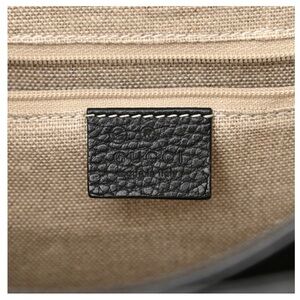 The bag has an optional waist-length shoulder strap in gold, a leather top handle, and a facing flap with a polished gold interlocking G closure hardware. The flap opens to 3 partitioned beige fabric interior compartments with zipper and patch pockets. Excellent Like New Condition