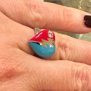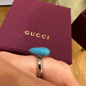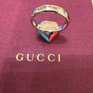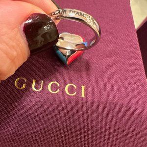 A continuation of the designs seen in Gucci Love Parade, earrings and stackable rings appear in two dimensions for Gucci Cosmogonie. The Interlocking G is enriched with coloured resin in this heart lightning charm ring.