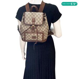 The GUCCI Interlocking G Backpack in Brown with Beige Supreme Canvas showcases the classic GG pattern with the signature Interlocking G logo. Stylish and functional, it offers spacious compartments and leather trim for everyday luxury.
