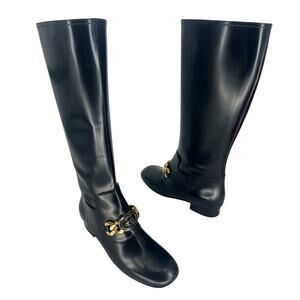 Elevate your collection with these Gucci Interlocking GG Chain Knee Boots, crafted in glossy black patent leather with a sleek retro silhouette. Featuring a bold gold-tone chain strap with an enamel Interlocking GG logo at the vamp, these boots strike the perfect balance between luxury and statement style. Designed with a knee-high shaft, side zip closure, and classic round toe, they are finished with smooth leather lining and soles for a sophisticated fit. Perfect for pairing with mini skirts, dresses, or skinny trousers, these standout boots capture Gucci’s timeless Italian craftsmanship and signature detailing.