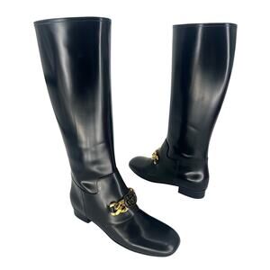 Elevate your collection with these Gucci Interlocking GG Chain Knee Boots, crafted in glossy black patent leather with a sleek retro silhouette. Featuring a bold gold-tone chain strap with an enamel Interlocking GG logo at the vamp, these boots strike the perfect balance between luxury and statement style. Designed with a knee-high shaft, side zip closure, and classic round toe, they are finished with smooth leather lining and soles for a sophisticated fit. Perfect for pairing with mini skirts, dresses, or skinny trousers, these standout boots capture Gucci’s timeless Italian craftsmanship and signature detailing.