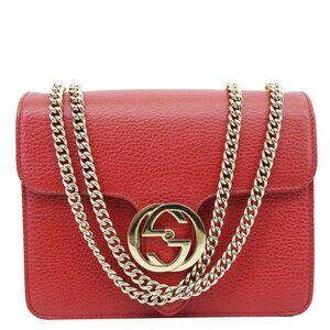 The Gucci Interlocking GG Small Dollar Calfskin Leather Crossbody Bag in Red features a sleek design with an iconic GG motif and polished gold hardware. Crafted from high-quality calfskin leather, it adds a touch of luxury to any outfit.