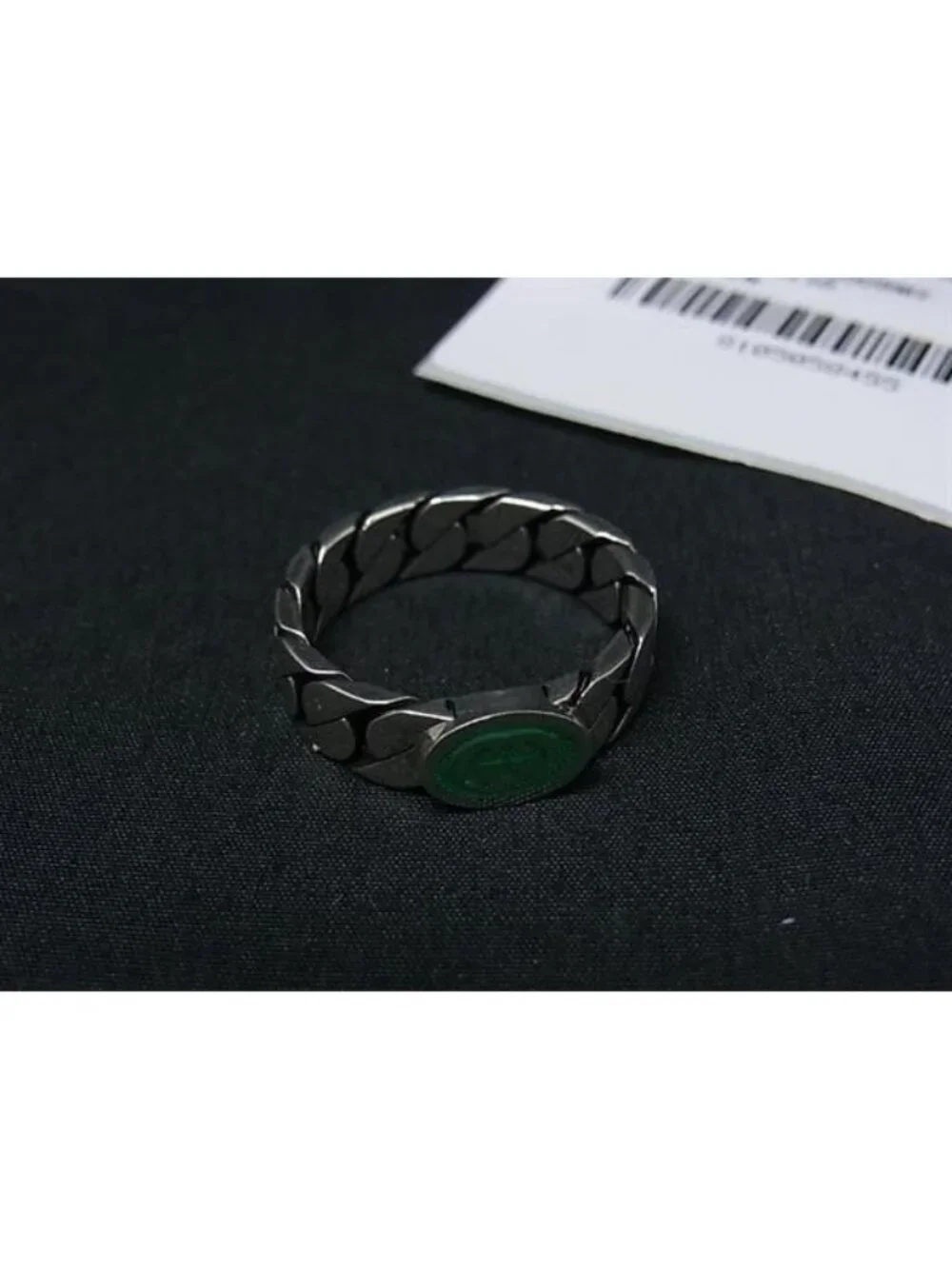 This is an authentic Gucci Ring in silver-tone. The ring features a sleek, interlocking design with a green-toned cabochon stone at the center.