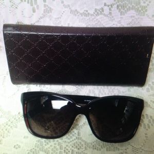 This is a beautiful brown tortoise sunglasses with red and green band on both temples. It is in very good condition as shown in photos. It is marked: Gucci, Made in Italy, CE. GG 3645/S DWJHA, 56 15 Optyl plus GG on each side temple and signed Gucci on its glasses. The brown case measures about 6.5 inches long, 3 inhces wide and 2.5 inches deep.