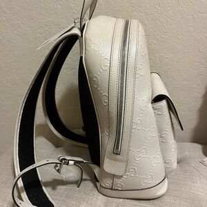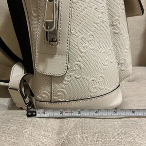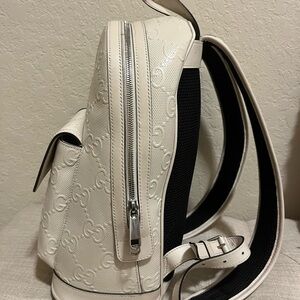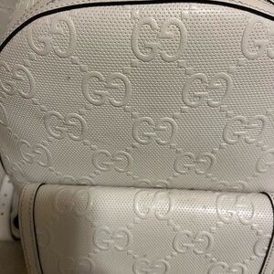 Elevate your style with this Gucci white embossed backpack. Perfect for any occasion, this bag combines luxury and functionality. Perfect for everyday use.