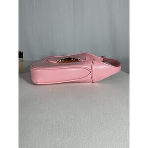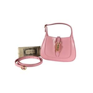 Gucci 'Jackie 1961' Pink Leather Mini Shoulder Bag: light gold-toned hardware, pink leather lining, interior zip and slip pockets, piston closure, flat leather shoulder strap, measurements: 5 inch bag height x 7.5 inch bag width x 1.5 inch bag depth x 4 inch handle drop x 25 inch shoulder strap drop, light scuff mark on the back of the outer clasp and on interior slip pocket, does not include original packaging or care cards, includes branded dust cover and shoulder strap, handle and strap drop heights can be adjusted.
