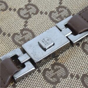 Elegant Gucci card holder with signature monogram. Features tan canvas and brown leather trim. Silver clasp detail adds sophistication.