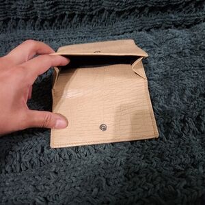 This cream wallet features a sleek and minimalist design, crafted from leather with a subtle grainy texture. Its compact square shape and unique closure make it a stylish and practical accessory for everyday use. Please be aware this is a vintage wallet and has been well loved so it does have flaws as pictured