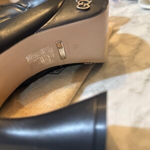 Fits true to size, order your normal size Round toe Functional inside zip Studded detail with double G logo at platform 4.5" flared heel, 1.5" platform, feels like 3" heel Leather upper, lining and sole Made in Italy