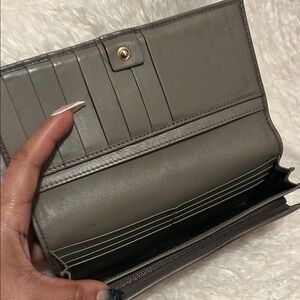 Minor leather discoloration gives wallet a natural/rustic look but great overall condition. Leather looks both grey and brown. Interior looks more pewter.