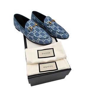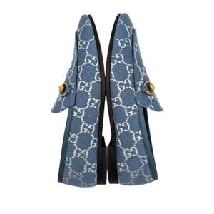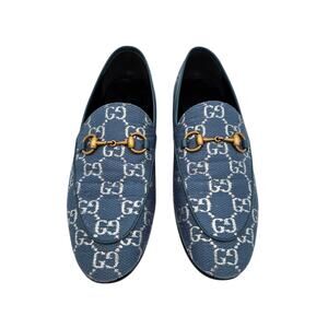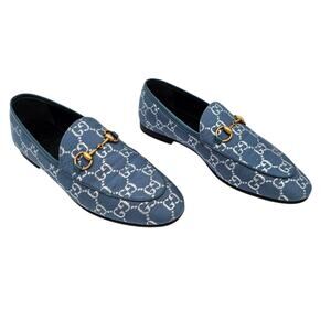 Gucci Jordaan Horsebit Flat Loafer Size 37 US 7 Blue Silver GG Monogram Canvas
