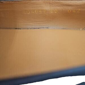 Crafted from smooth black leather, these iconic slip-on flats feature the signature gold-tone horsebit detail across the vamp. These loafers are Size IT 40 (US 10) and have a sleek almond toe silhouette, leather insoles, and a low stacked heel for all-day comfort. The interior is lined with supple tan leather for a luxurious feel.