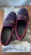 Navy blue and red loafers.