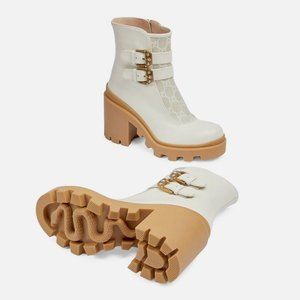 The style is presented in a mix of white leather with monogram canvas, a platform paired with a moderate heel height make these boots take you from day to night.