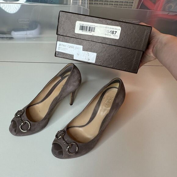 Gucci Kid Scamosciato New Mauve Gray Suede Horsebit Open Toe Stiletto Heel 38