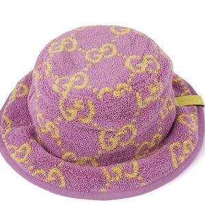 Chic Gucci bucket hat for kids. Features a lavender and lime pattern. Adds flair to any look.