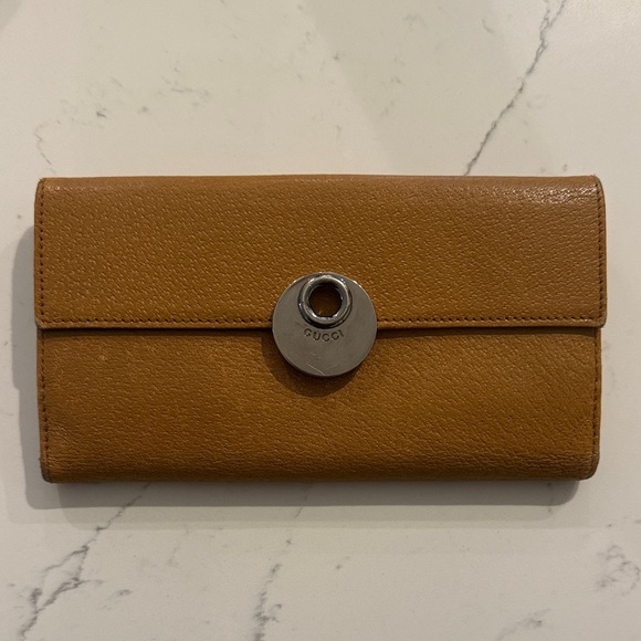 Gucci Large Leather Checkbook Wallet Camel 231835