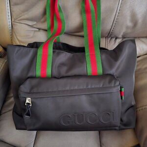 Gucci Logo on front Compartment. Has a zipper pocket in the interior. Nylon Material. New - never used