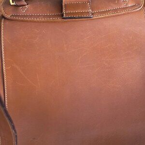 light scuffing and creasing throughout consistent with age. Bamboo handle is intact with no cracks. All hardware and buckles function properly.