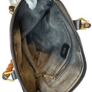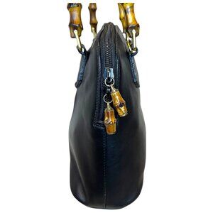 This vintage Gucci bag has soft supple leather, but structured., real bamboo handles and double bamboo zipper pulls. It is missing detachable strap to turn the top handle bag into a shoulder / cross body bag. You can easily buy a black strap to add to the bag if you choose. The inside of the bag is clean and has the Gucci stamp underneath, and a back zipper pocket with signature gold Gucci Medallion zipper pull. There is wear on the feet, but in overall good condition.